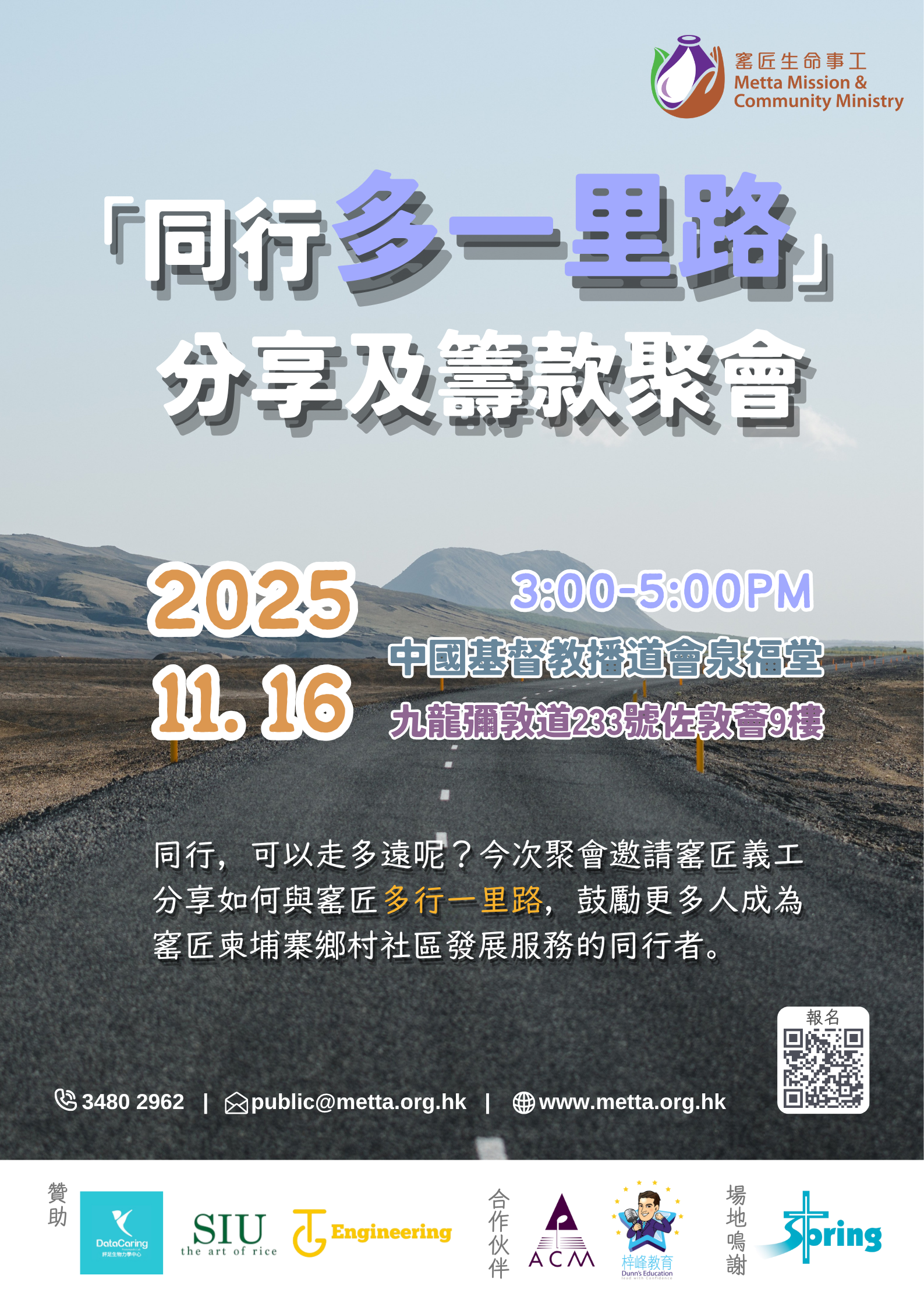 同行,可以走多遠呢?今次聚會邀請窰匠義工分享如何與窰匠多行一里路,鼓勵更多人成為窰匠柬埔寨鄉村社區發展服務的同行者。